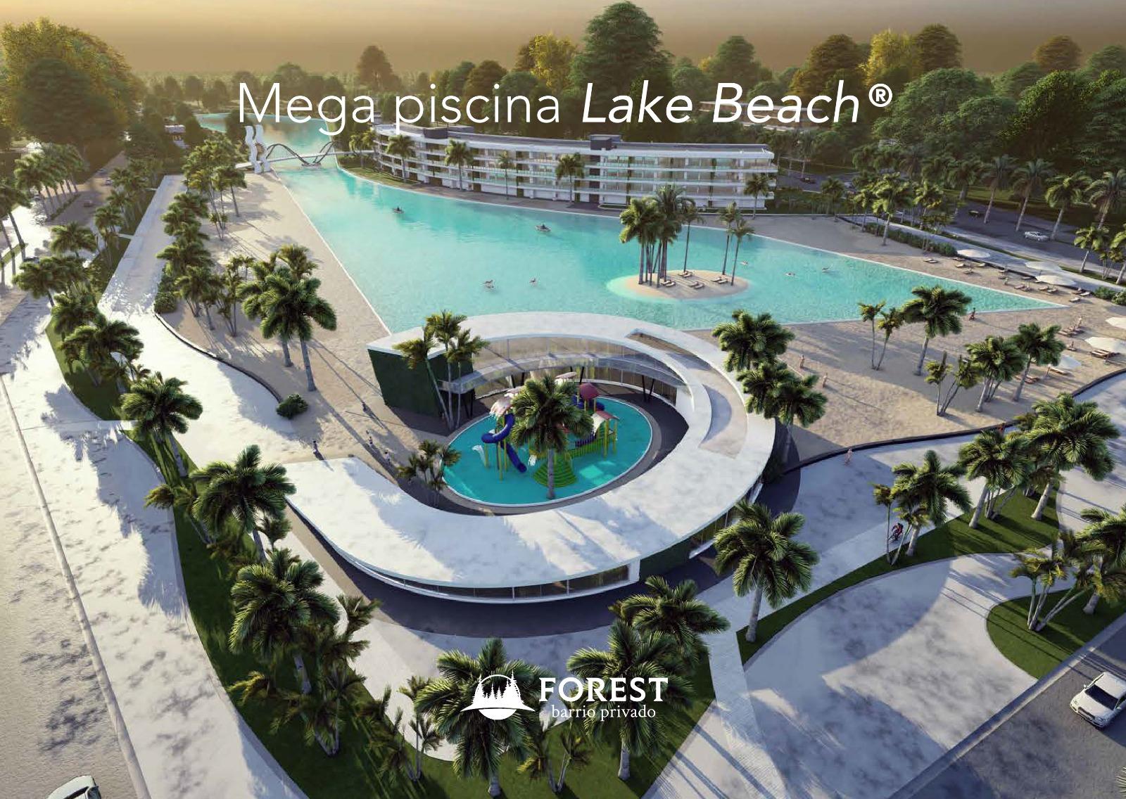 Área Lake Beach: mega piscina de 3 hectáreas, que contará con playa propia, palmeras sombrillas, lo que hará que tengas la playa siembre cerca. Actividades náuticas como buceo, beach volley, beach handball, kayak, paddle de agua.