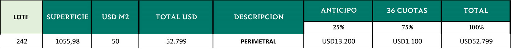 Forma de pago: 25% al anticipo (dolar billete) y 75% financiado en 36 cuotas mensuales y consecutivas.