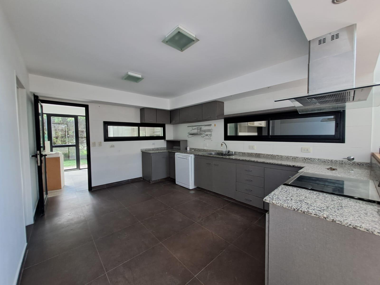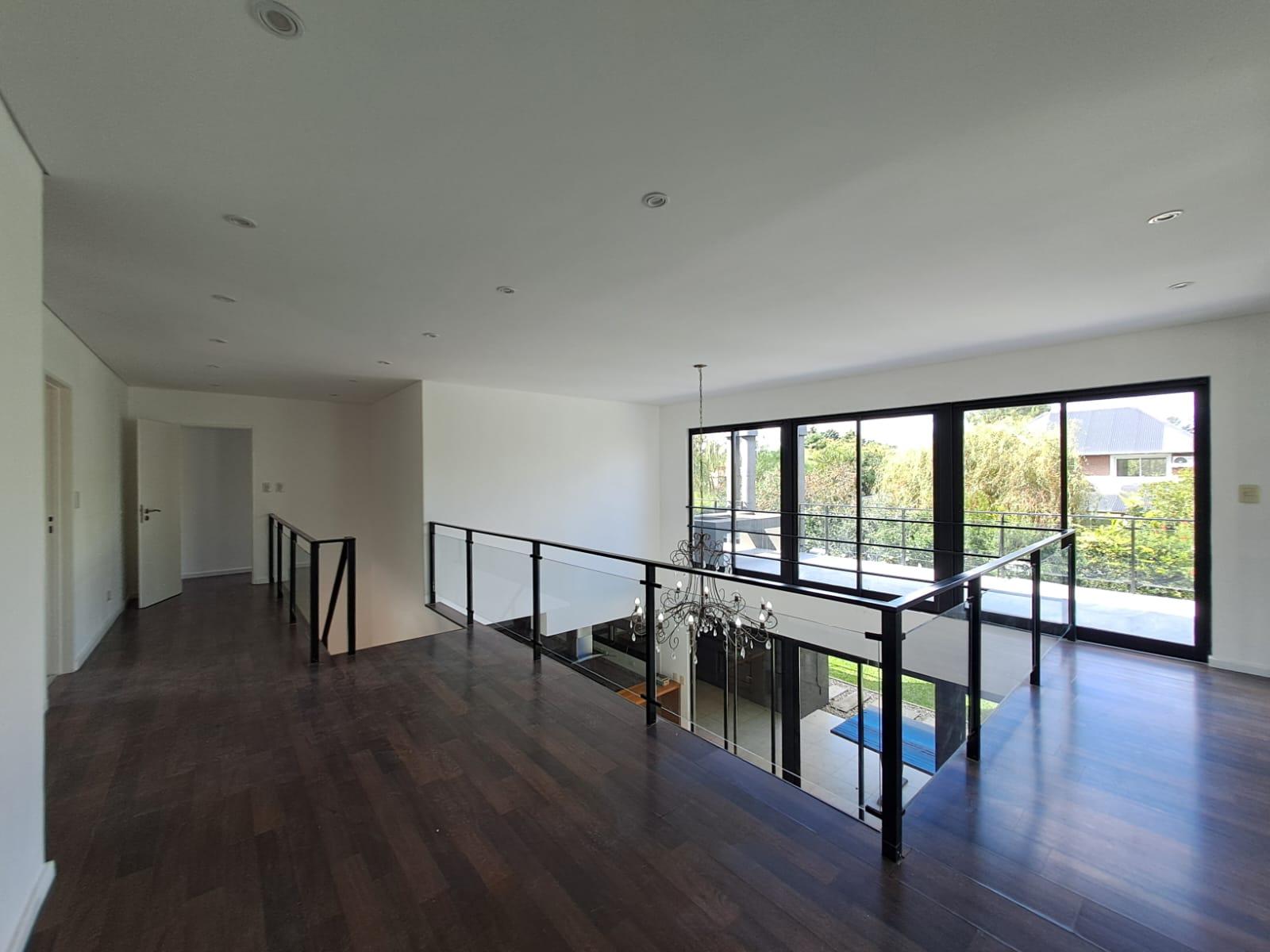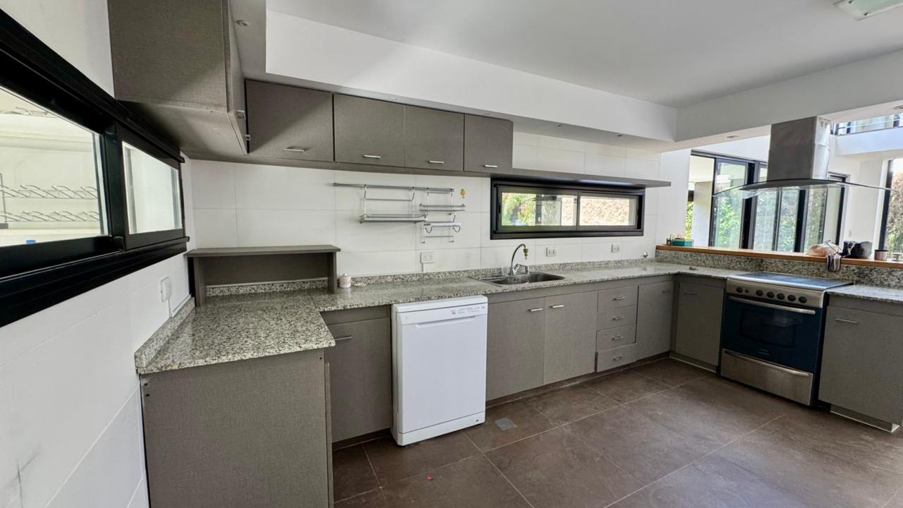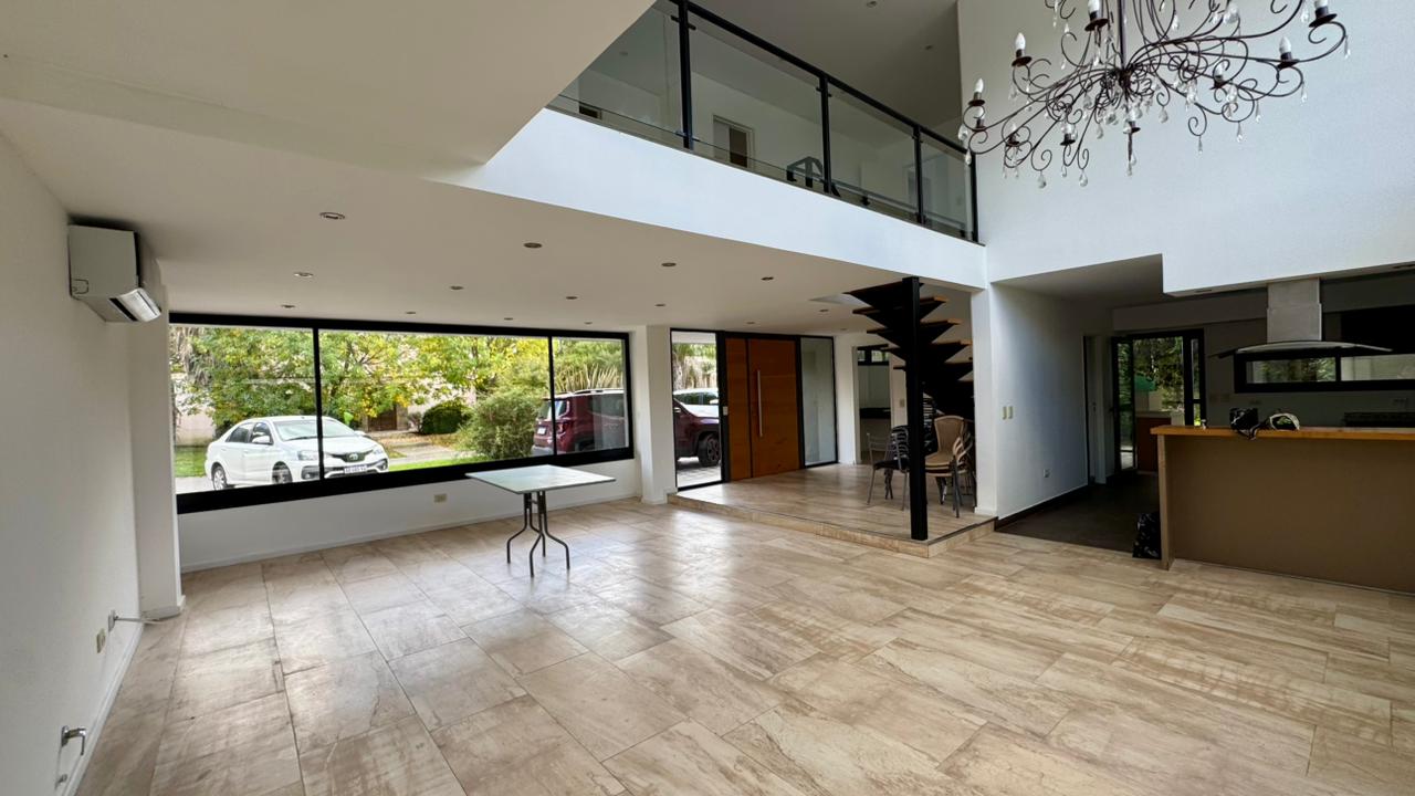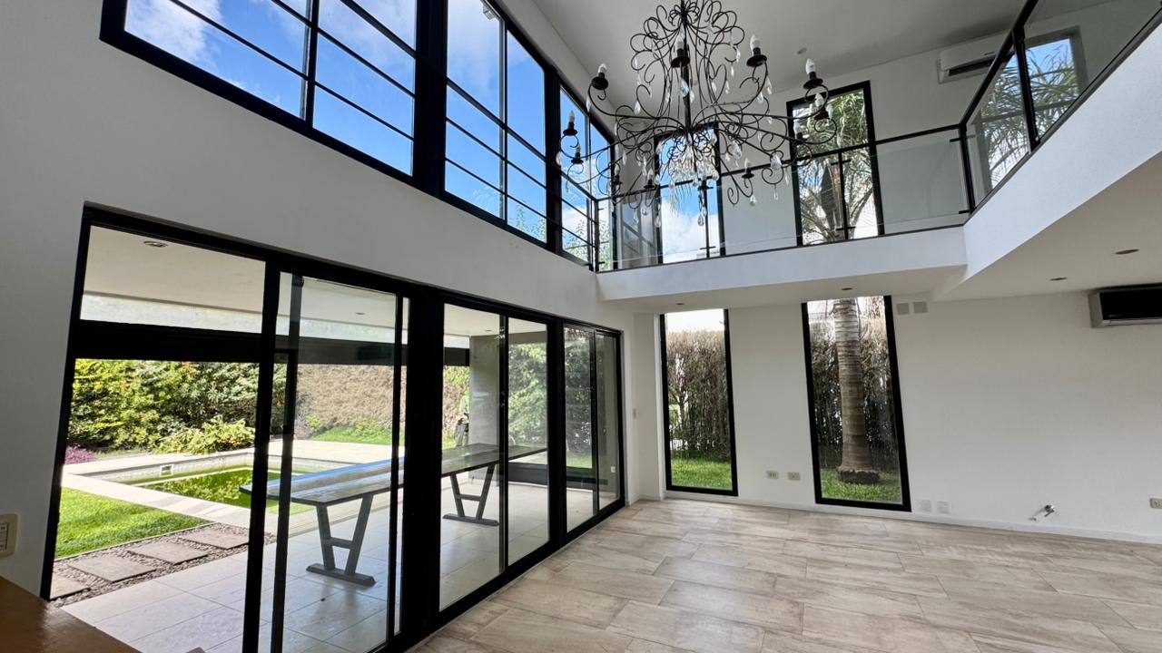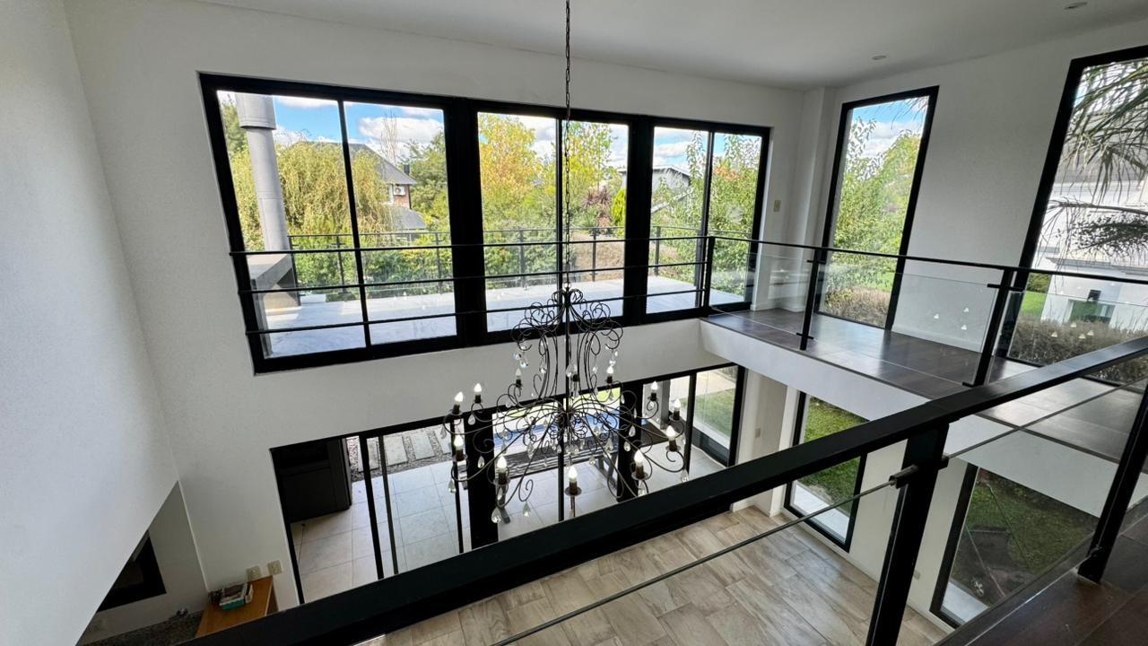 El living en doble altura potencia esta sensación de amplitud y luminosidad, generando un espacio abierto que respira y se expande hacia el jardín. La cocina integrada acompaña esta dinámica, pensada para compartir y disfrutar con vistas constantes al verde. Completan la planta baja el lavadero independiente, toilette de recepción, habitación de servicio con baño y quincho cerrada con mobiliario.